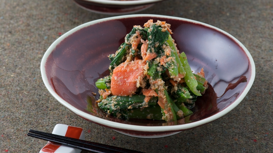 サッとゆでた小松菜にさけとごまをたっぷりまぶせば、ご飯にもお酒にも合う一品に。