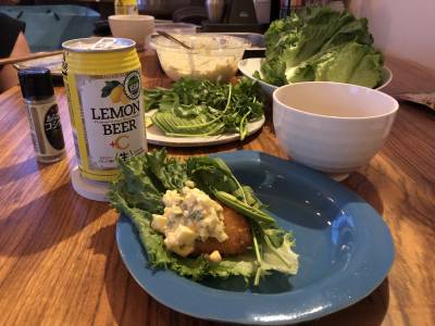 たまねぎ180gはみじん切りにして塩小さじ1をふり、固く絞ったさらしの布巾で茶巾状に包み、しんなりするまでもむ。ボウルにはった水に包んだまま入れ、出てきたぬめりを洗い落とし、水けを絞る。
