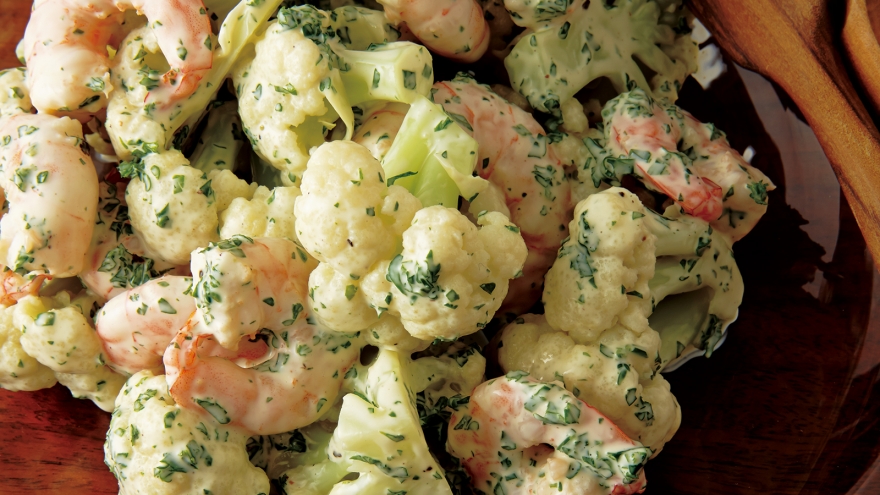 鍋に湯(約カップ4)を沸かして塩小さじ1/2を入れ、カリフラワーを2回に分けてゆで、冷水にとって冷まし(全体備考参照)、水けを拭く。残った湯にえびを入れて1~2分間ゆで、冷水にとって冷まし、水けを拭く。