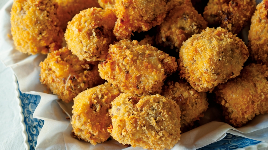 3に2を加えて混ぜ、24コの俵形にまとめる。強力粉をまぶして溶き卵を全体につけ、パン粉をまぶす。