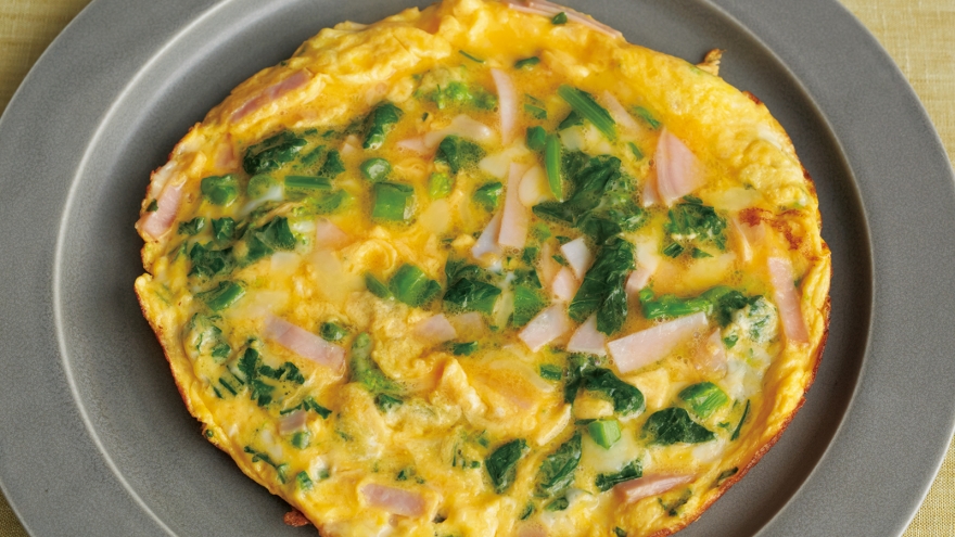 半熟状の卵に、菜の花とハムの春色がよく映えます。ひっくり返して両面を焼かなくても、トロリとした食感がおいしい!