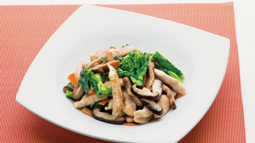 肉の色が変わったら、にんじんを加えて1~2分間炒め、しいたけ、菜の花を順に加える。さらに2~3分間炒め、塩・こしょう各少々で味を調える。