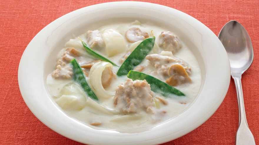 ホワイトソースも生クリームも使わない、軽やかな味わいのシチューです。絹さや入りで、彩りも春らしく。