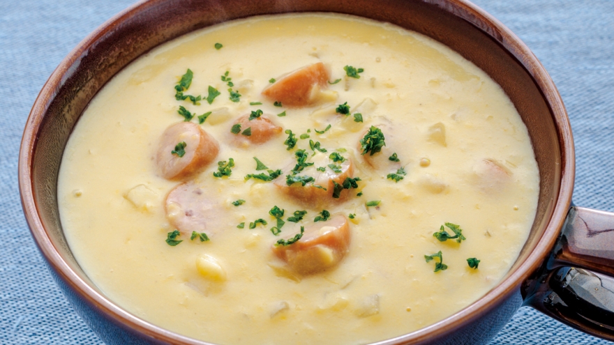 缶詰とソーセージを使ってつくるコーンチャウダー。 手軽においしく召し上がれます。