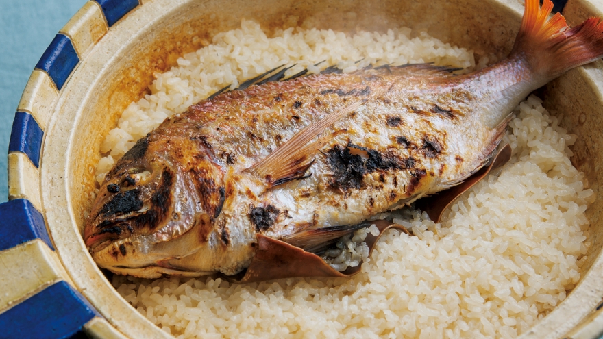 鯛(たい)を一匹使って、土鍋で炊いた鯛めし。蒸らしてふたを取れば、食欲をそそるよい香りが広がります。見た目も豪華で、お祝い事にもぴったり。