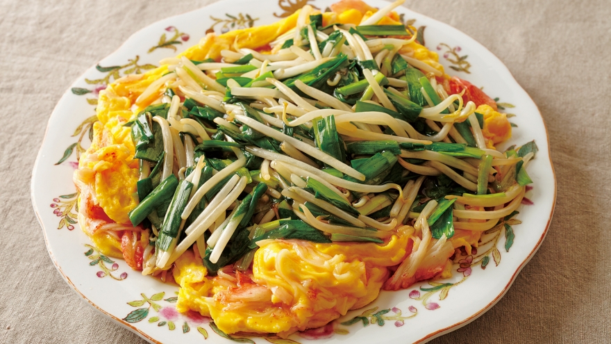 にらともやしをポリ袋に入れてサラダ油大さじ1/2をまぶし、フライパンに入れて強火で炒める。3を加えてとろみがつくまで炒め合わせ、2の卵の上にかける。