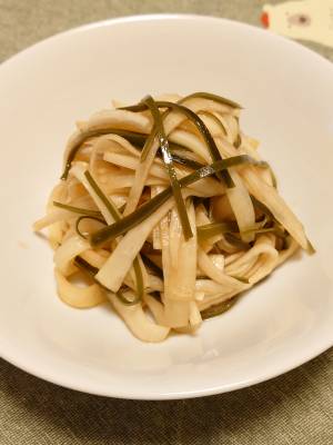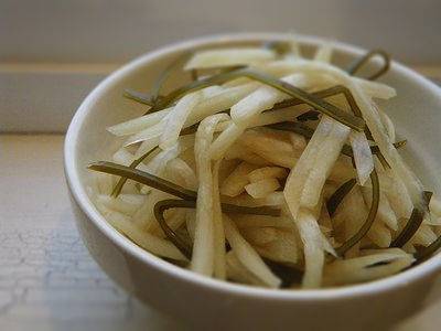 大根の皮はせん切り、昆布(だし用)は細切りにする。いっしょにボウルに入れ、しょうゆ大さじ1弱をふりかけ、よく混ぜて約10分間おく。