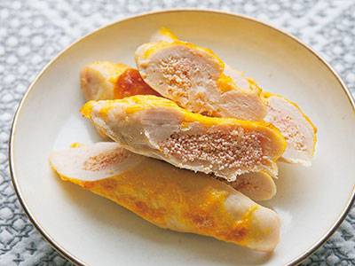 開いたささ身にたらこを忍ばせて、オーブントースターで焼きます。卵黄で照りをつけると、彩りもよく、見た目もおいしそうに。