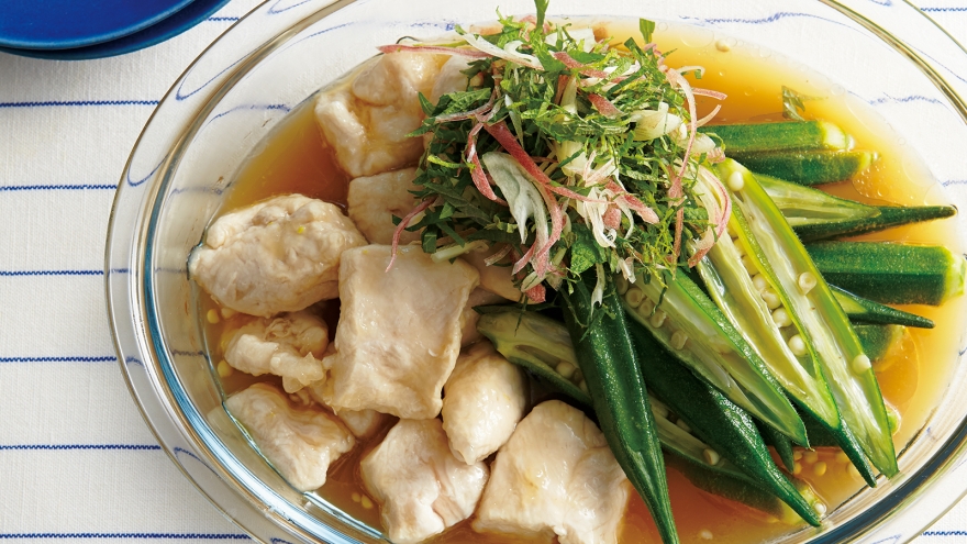 鍋に湯を沸かし、オクラを20秒間ほどゆでて網じゃくしで引き上げる。縦半分に切り、熱いうちに2につける。同じ湯でささ身を2分30秒間ほどゆで、網じゃくしですくい、2に加えてつける。みょうがと青じそを添えて食べる。
