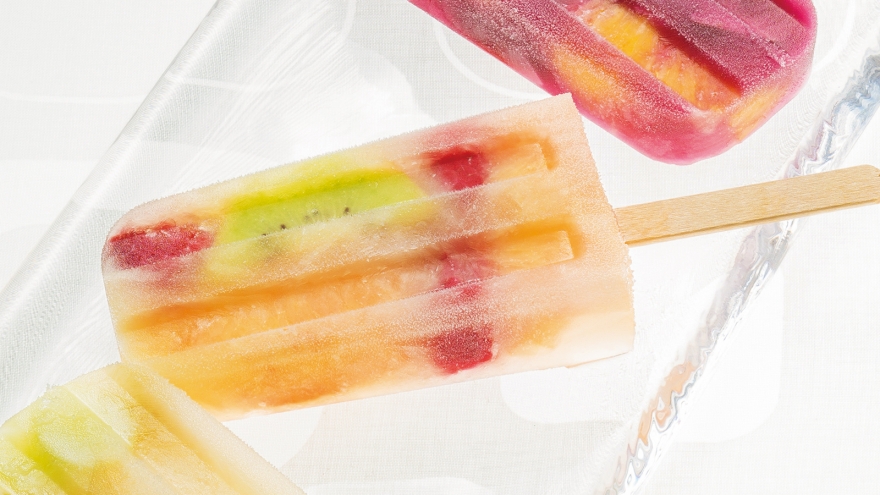 【A】を混ぜて溶かし、アイスキャンデーの型に約2cm深さまで入れる。1を彩りよく加え、残りの【A】を縁より5mm下まで注ぎ、ふたをする。
