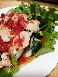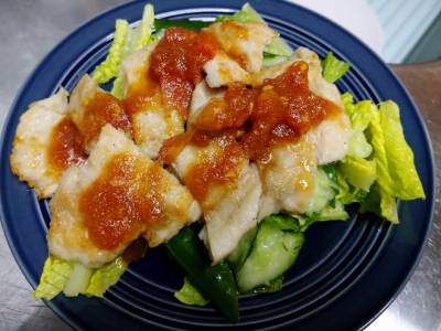トマトはヘタを取ってすりおろしてボウルに入れ、【B】を加えて混ぜる。器にサニーレタス、きゅうりを盛り、2を食べやすく切ってのせる。トマトだれをかける。