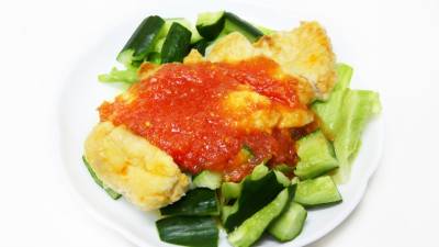 下ごしらえは包丁いらず。たたいて、ちぎって、すりおろすだけ。揚げ焼きした鶏むね肉とたたききゅうりに、すりおろしたトマトのたれをからめてさっぱりといただきます。