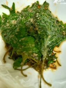 水カップ2+1/2に塩大さじ1を混ぜて塩水をつくる。青じそを塩水に10分間つけ、水けをきる。