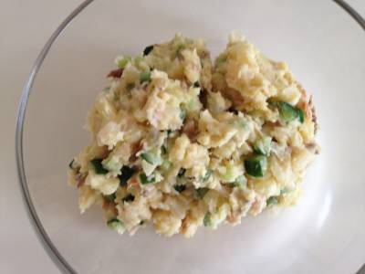 干物と漬物で、ポテトサラダの味にぐっと奥行きが加わります。漬物は何でもOKですが、食感のよいものを使うと歯ごたえを楽しめ、さらにおいしい!