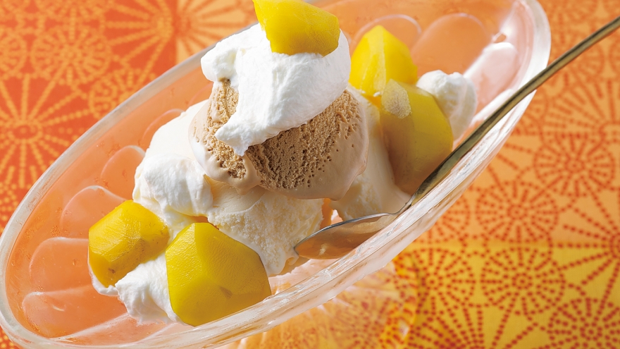 バニラアイスクリーム・コーヒーアイスクリーム・ホイップクリームを器に盛り、栗の甘露煮をのせる。大きければ、食べやすい大きさに切る。