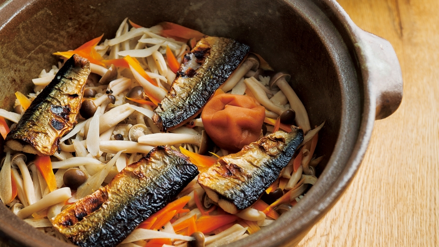 新米とさんま、秋の味覚を一度に楽しめるご飯。さんまのうまみと梅干しの酸味がよく合います。