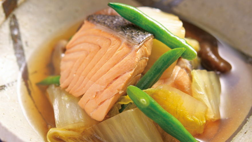 一緒によく煮ることで、さけに白菜としいたけのうまみを吸わせます。