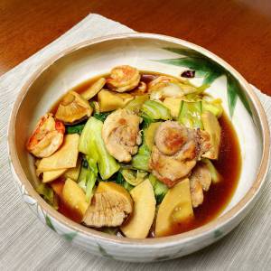 干ししいたけ、鶏肉、えびが入ったボリュームたっぷりの和風あんかけです。乾物はうまみも多くおすすめの食材ですよ。
