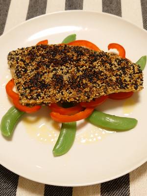 白ごまと黒ごまを別のバットに入れて混ぜる。2のいさきを入れて両面にごまをまぶしつける。