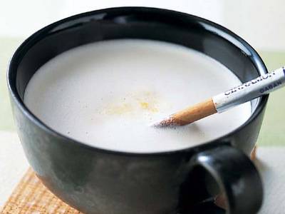 コップに注ぎ、しょうがをのせ、シナモンスティックを添える。