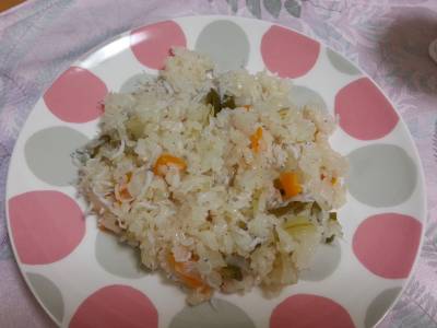耐熱容器に米、スープ、白ワインを入れ、20分間おく。野菜類と塩、こしょう、バターを加えて混ぜ、ラップまたはふたをして電子レンジ(600W)に5分間かける。取り出して、ちりめんじゃこを入れ、周囲から真ん中へと混ぜる。平らにならし、再びラップをして5分間おき、電子レンジに4分間かける。取り出して10分間蒸らす。