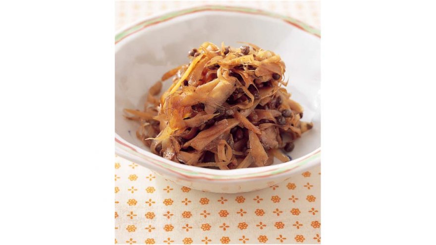 鍋に1のごぼうを入れて火にかけて、水けをとばすようにしている。しんなりとしたら、だし、実山椒のつくだ煮、みりん、酒、うす口しょうゆを加えて、ごぼうが味を含むまで2~3分間煮る。