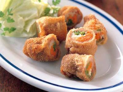 薄切り肉で野菜をクルッと巻いて一口サイズの揚げ物に。肉の分量が少なくてもボリューム感が出ます。