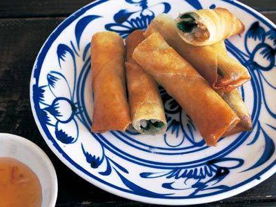 180℃の揚げ油で、2の春巻を色よく揚げる。長さを半分に切って器に盛りつけ、スイートチリソースを添える。
