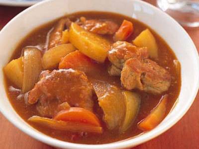 3の鍋にサラダ油大さじ2を足し、しょうがとにんにくを入れて香りが出るまで中火でいため、カレー粉、小麦粉大さじ1を順に加えて1分間いため、たまねぎ、にんじん、一口大に切ったじゃがいもの順に加えていためる。
