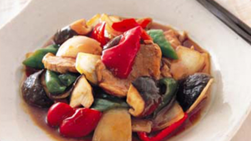 豚肉は1cm厚さに切る。たまねぎは2~3cm角に切る。しいたけは石づきを切り落としてからそぎ切りにする。ピーマン2種は乱切りにする。
