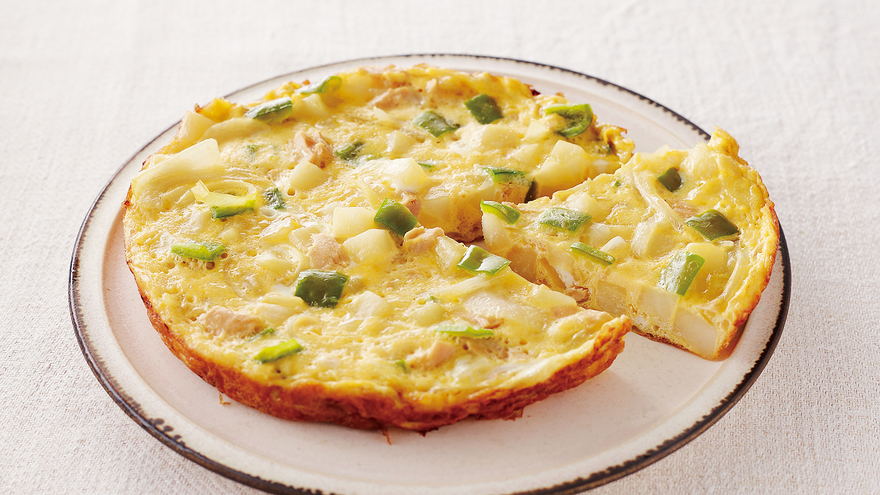 返さず焼き上げる簡単オムレツ。火の通りにくい野菜から順に炒め、卵を流して仕上げます。ツナの代わりに、ハムやベーコンでも。