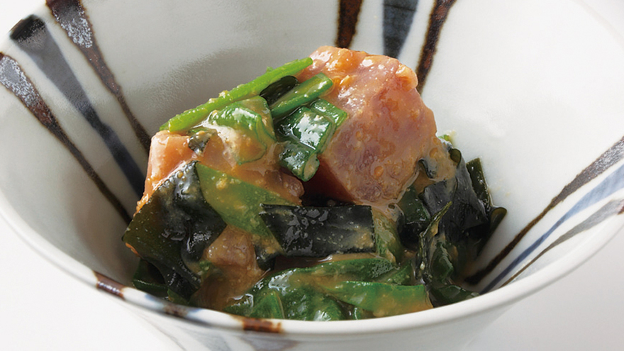 玉みそに、からしと酢を加えた、風味豊かで後口のすっきりしたあえ物です。酒の肴にもおすすめの一品。