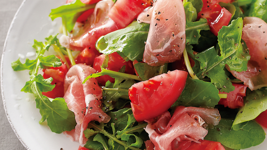 ボウルに1のルッコラとトマトを入れて【イタリアンドレッシング】をかけ、混ぜてからめる。生ハムを加えてサックリと混ぜ、器に盛って黒こしょうをふる。