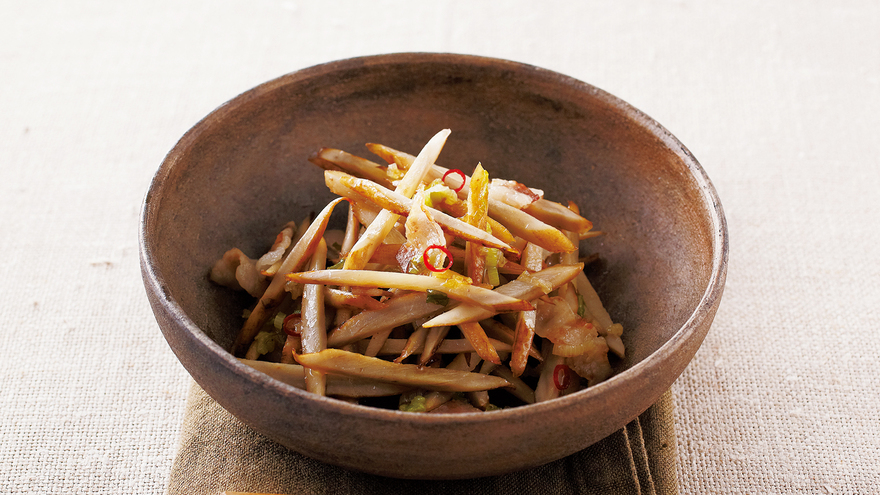 肉をプラスして、きんぴらごぼうをアレンジ。豚バラ肉の脂とねぎの風味をごぼうにからめるように炒めます。コクのある塩味で、あとを引くおいしさ!