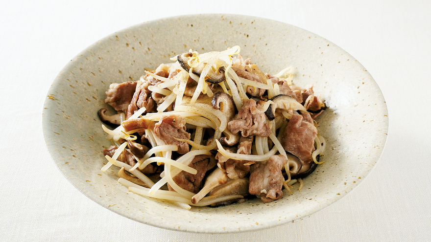 豚肉は1枚ずつ広げたり、ほぐしたりせず、パックから取り出したまま焼くと、下の部分はこんがりし、上のほうはゆっくり火が通って柔らかくなる。野菜を加えたら、木べらで軽く押しながら焼くと熱がこもって火の通りがよくなる。肉に火が通って野菜が温まったら、木べらで底からすくって上下を返し、水けをとばすように炒める。