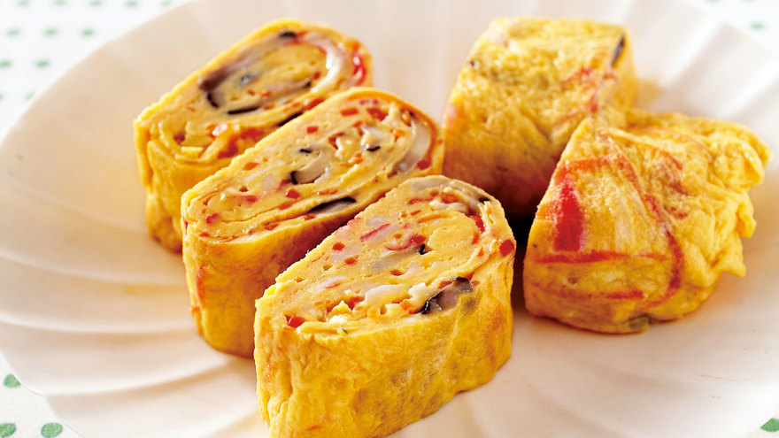 炒めた具を卵液に加えて普通に焼くだけ。かにかまぼこやしいたけのうまみが全体に広がる風味豊かなおかずです。