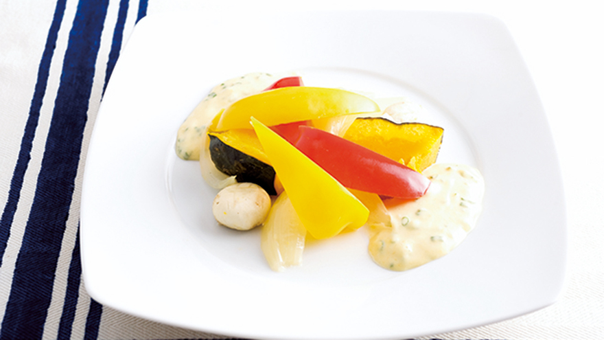 フライパンにかぼちゃ、たまねぎ、マッシュルーム、水カップ1/4を入れ、ふたをして中火で蒸す。かぼちゃが柔らかくなったら、パプリカを加え、温める程度に蒸して火を止める。蒸し汁をきって器に盛り、ねぎみそマヨネーズを添える。