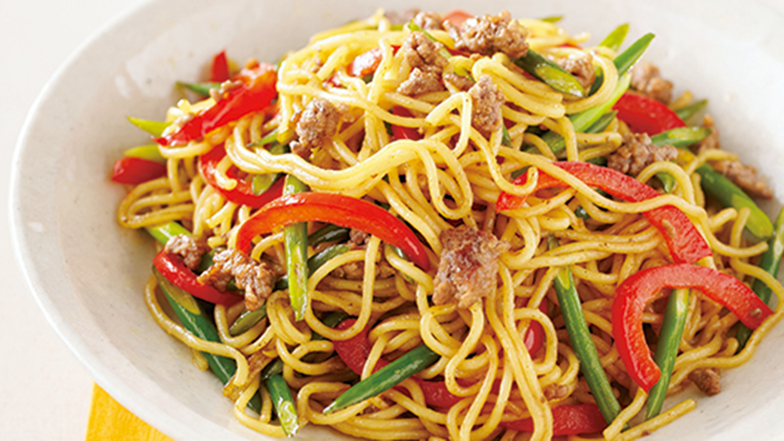 ひき肉は焼きつけてから炒めると、自然に小さくまとまります。カレー粉とオイスターソースを加えて、風味豊かなエスニック味に!