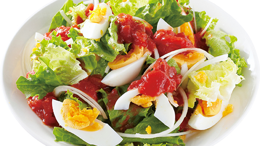 グリーンリーフとたまねぎはざるに上げて水けをきり、さらにペーパータオルで水けを拭く。器に盛ってゆで卵を散らし、【トマトドレッシング】をかける。