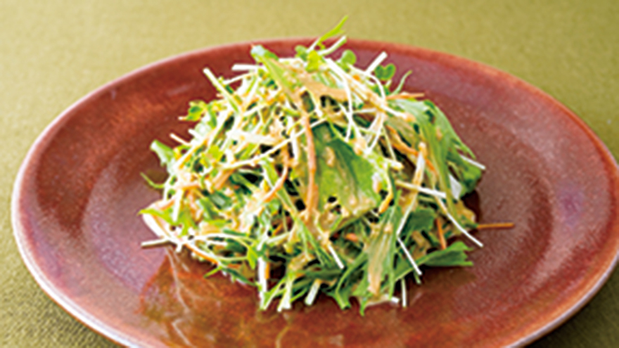 細く切りそろえた野菜のシャキシャキ感を楽しむサラダです。ごまだれにしょうがを加えて清涼感のある味わいに。