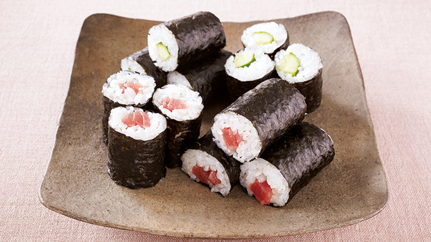 定番のかっぱ巻きも鉄火巻きも、ラップにお任せです。ブツ切りのまぐろを使ったらお財布にやさしいごちそうに。
