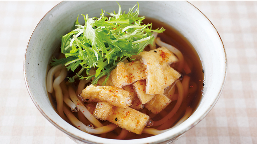 シャキシャキの水菜とだしのうまみがしみ込んだ油揚げ。 具の相性のよさはうどんのおいしさを倍増させます。