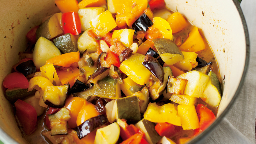 鍋にオリーブ油、にんにくを入れて弱火で炒める。香りがたったらアンチョビを加えて中火にし、木べらで軽くつぶしながら炒める。アンチョビがチリチリしたら、たまねぎを加えて炒め、油が回ったら、ズッキーニ、パプリカを順に加えて炒める。全体が温まったら、ケイパー、レーズン、松の実、オレガノ、白ワインビネガーを加え、弱火にしてざっと混ぜる。砂糖、塩一つまみ、トマトを加えてふたをし、時々鍋を揺すりながら8分間ほど煮る。