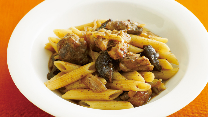 バルサミコ酢とプルーンが、奥深い甘みとコクの秘訣。しっかり味のソースには、かみ応えのあるペンネが合います。