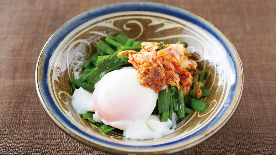 にらはゆでず、熱湯につけて半生っぽい食感と風味を楽しみましょう。温泉卵でキムチの辛みがまろやかに。