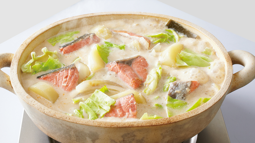 昆布だしでじっくり煮た野菜の甘みと鮭(さけ)の塩けが絶妙のバランス!牛乳とバターのコクが、みそ味にまろやかな風味を与えます。