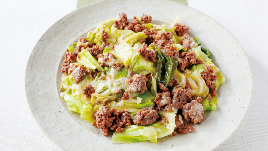 さっぱりキャベツにひき肉のうまみとチーズのコクをプラスします。牛乳をかけて、クリーミーに蒸しましょう。