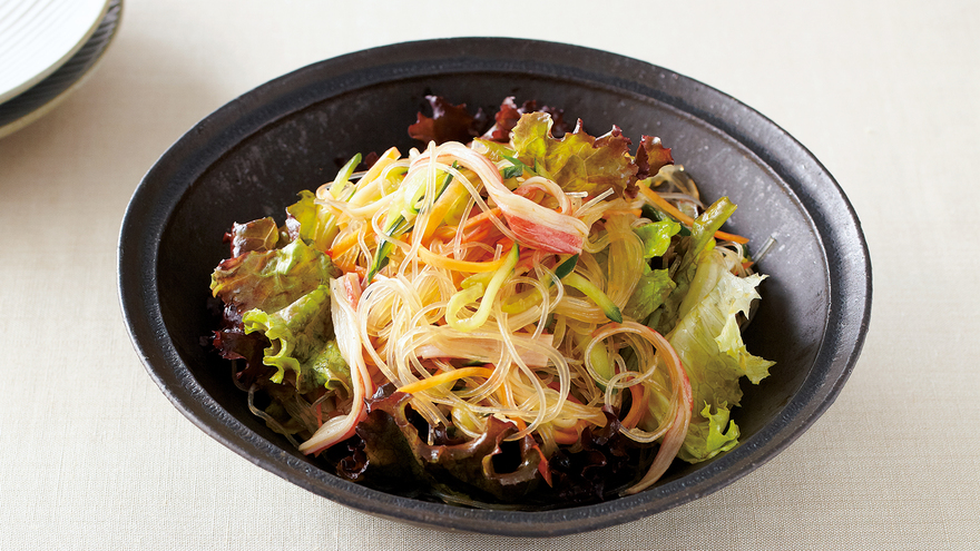 春雨は歯応えを残してコシを出し、せん切り野菜は塩水をからめて程よくしんなり。甘酸っぱい味つけで、ご飯によく合うサラダ。