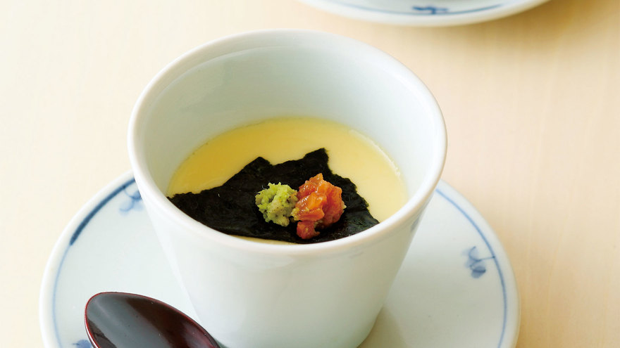 具を入れずにつくる、滑らかで品のよい味わいの茶碗(わん)蒸しです。梅干し、のり、わさびをのせて、アクセントに。