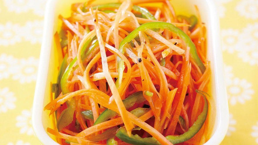 にんじんは皮付きのまません切りに。時間がたっても食感がよく、風味も長もちします。ピーマンの色と香りがアクセント。